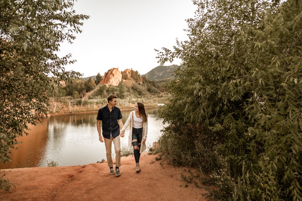 And the location I chose is magical too, let me tell ya. This Southern Colorado Springs oasis has it ALL. Mountain views, a pond, trees, greenery, field space, red rock formations, you name it. Basically, it’s a mini, lesser-known Garden of the Gods with a whole lot more variety and a whole lot less tourists. BINGO! That’s my kind of place. Pair that with almost-autumn scenery, a precious couple, real connection and emotion, some bomb lighting, and well, the result is this….